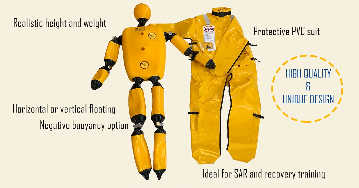 Dacon Rescue Dummy has a height of 190 cm and adjustable weight from 22-85 kg/49-187 lbs. To get your desired weight, you simply fill it with water.